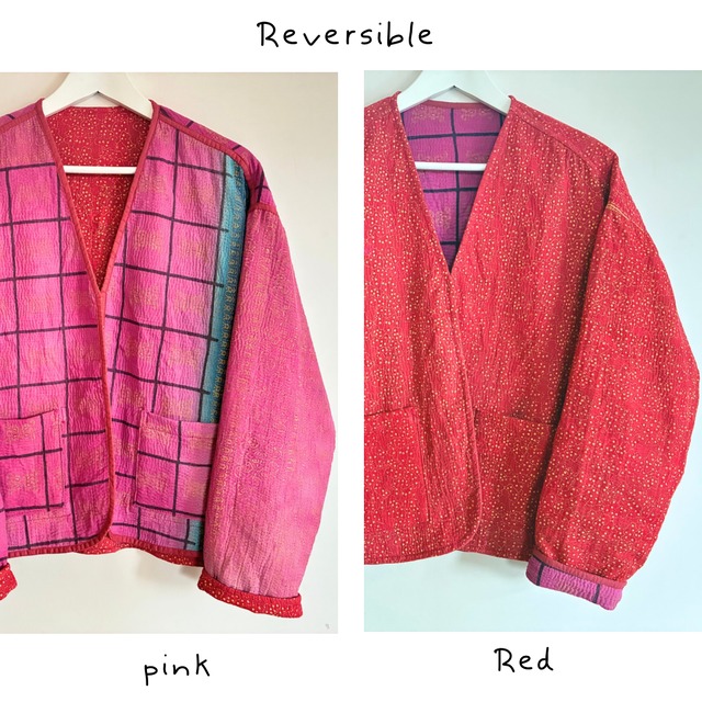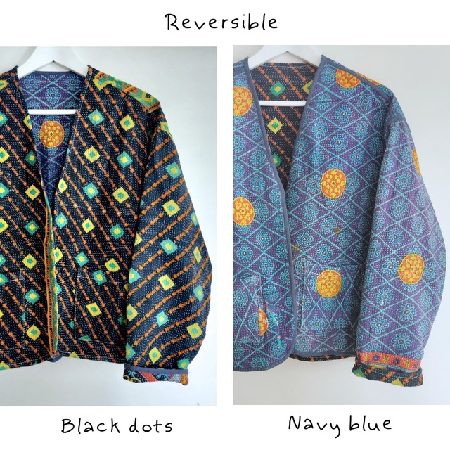ヴィンテージのラリーキルトジャケット。 世界にひとつの一点物です。 細かいステッチが美しく、表情の違いが楽しいリバーシブル。 長過ぎず短過ぎずパンツにもスカートにも合わせやすい丈です。 肩落ちデザインのドロップショルダーでリラックス感ある着こなしを楽しめます。 ヴィンテージキルト リバーシブル仕様 両面ポケット付 【Size】 着丈 58cm 身幅 58cm 肩幅 60cm(ドロップショルダー) 袖丈 50cm 【Attention】 本製品は、ヴィンテージラリー(カンタ)キルトを使用しています。 インドの職人や女性達が手作りした温かみあふれる生地です。 手作りならではの不揃い感や個性(染めムラ、色抜け、シミ、繕い等)がある場合がございます。 また、サリーや古布を使用した生地のため、使用感や経年劣化がございます。 ヴィンテージ商品にご理解の上、ご検討ください。 ※掲載画像の商品の色味は、光の照射や角度により実物と色味が多少異なる場合がございます。 【お洗濯について】 ぬるま湯と中性洗剤で手洗いか、ネットに入れて洗濯機の優しいモードで洗濯・脱水し、陰干ししてください。 水分を多く含んだまま干すと、生地が伸びてしまうので、手洗いの場合はバスタオルなどでしっかり吸水してから干してください。 ・色移りしやすい素材のため、濡れたまま放置、また淡色のものとの重ね着は控えてください。 ・漬け置きはせず、お洗濯後すぐに干してください。 ・酸素系漂白剤は使用しないでください。 ・長時間直射日光に当てると変色することがあります。