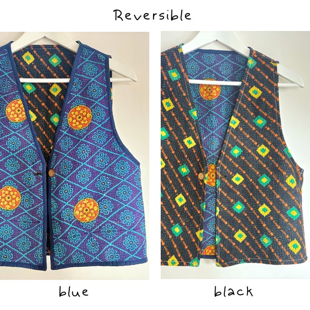 ヴィンテージのラリーキルトベスト。 世界にひとつの一点物です。 細かいステッチが美しく、両面の表情の違いが楽しいリバーシブル。 木製のボタンが片側に付いています。 長過ぎず短過ぎずパンツやスカート、ワンピースにも合わせやすい丈です。 【Size】 着丈 50cm 身幅 50cm 肩幅 35cm 【Attention】 本製品は、ヴィンテージラリー(カンタ)キルトを使用しています。 インドの職人や女性達が手作りした温かみある生地でデリケートです。 手作りならではの不揃い感や個性(染めムラ、色抜け、シミ、繕い等)がある場合がございます。 また、サリーや古布を使用した生地のため、使用感や経年劣化がございます。 ヴィンテージ商品にご理解の上、ご検討ください。 ※掲載画像の商品の色味は、光の照射や角度により実物と色味が多少異なる場合がございます。 【お取扱いについて】 ・インドの手仕事品です。特有のシミやほつれ、繕いがございます。 ・色移りしやすい素材のため、濡れたまま放置、また淡色のものとの重ね着は控えてください。 ・漬け置きはせず、お洗濯後すぐに干してください。 ・酸素系漂白剤は使用しないでください。 ・長時間直射日光に当てると変色することがあります。 【お洗濯について】 繊細な生地なので、ぬるま湯と中性洗剤で手洗いか、ネットに入れて洗濯機の優しいモードで洗濯・脱水し、陰干ししてください。 水分を多く含んだまま干すと、生地が伸びてしまうので、手洗いの場合はバスタオルなどでしっかり吸水してから干してください。