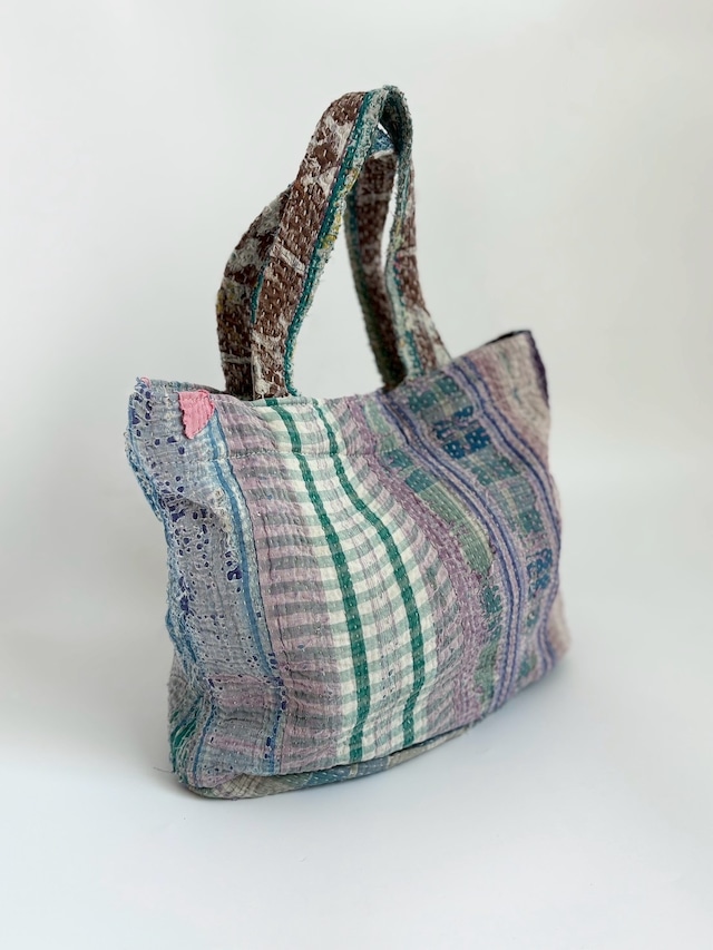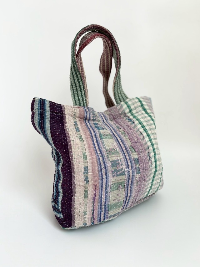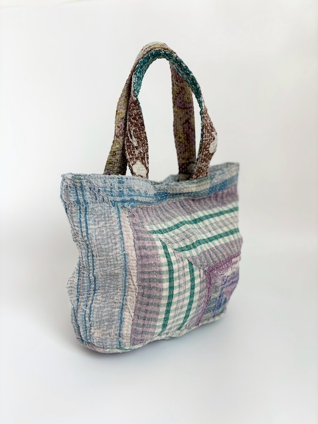 ヴィンテージラリーキルトのミニトートバッグ。 小ぶりなサイズ感ながら、マチがあるので、見た目より沢山入ります。 内側にはファスナー付きポケットがあり、貴重品も安心して収納可能。 開口部はマグネットボタン仕様です。 【Size】 タテ25cm ヨコ35cm マチ14cm 【Attention】 本製品は、ヴィンテージラリー(カンタ)キルトを使用しています。 インドの職人や女性達が手作りした温かみある生地でデリケートです。 手作りならではの不揃い感や個性(染めムラ、色抜け、シミ、繕い等)がある場合がございます。 また、サリーや古布を使用した生地のため、使用感や経年劣化がございます。 ヴィンテージ商品にご理解の上、ご検討ください。 ※掲載画像の商品の色味は、光の照射や角度により実物と色味が多少異なる場合がございます。 【お取扱いについて】 ・インドの手仕事品です。特有のシミやほつれ、繕いがございます。 ・色移りしやすい素材のため、濡れたまま放置、また淡色のものとの重ね着は控えてください。 ・漬け置きはせず、お洗濯後すぐに干してください。 ・酸素系漂白剤は使用しないでください。 ・長時間直射日光に当てると変色することがあります。 【お洗濯について】 繊細な生地なので、ぬるま湯と中性洗剤で手洗いか、ネットに入れて洗濯機の優しいモードで洗濯・脱水し、陰干ししてください。 水分を多く含んだまま干すと、生地が伸びてしまうので、手洗いの場合はバスタオルなどでしっかり吸水してから干してください。