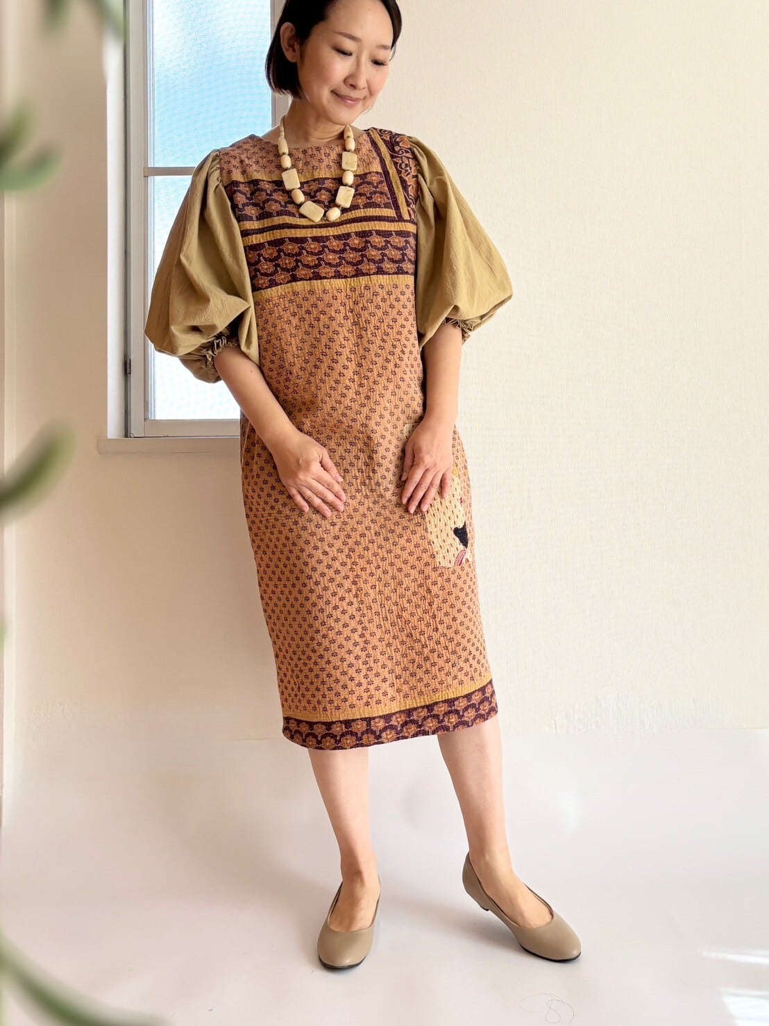 ヴィンテージラリーキルトとワッシャー生地のパフスリーブのワンピース。