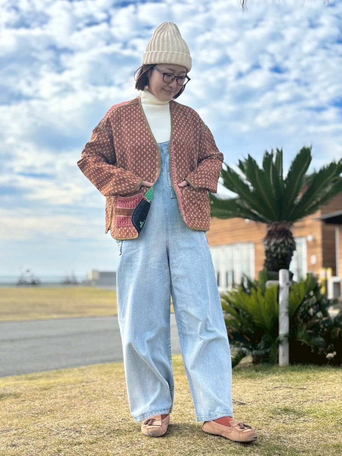 長過ぎず短過ぎずパンツにもスカートにも合わせやすい丈です。