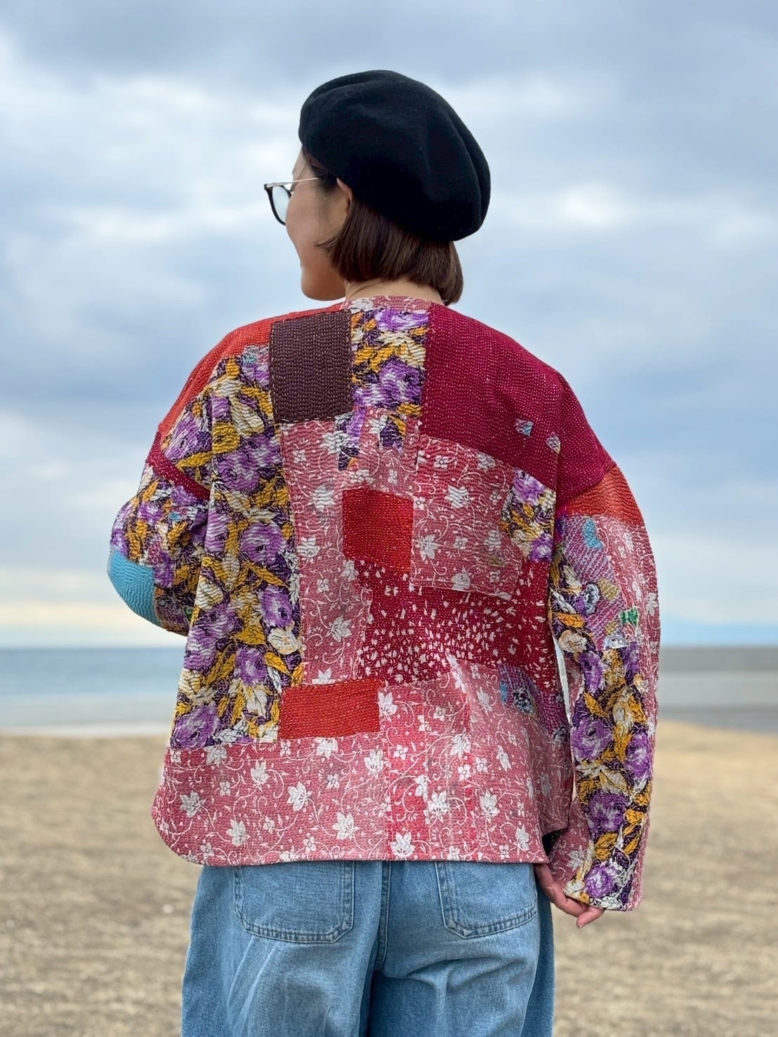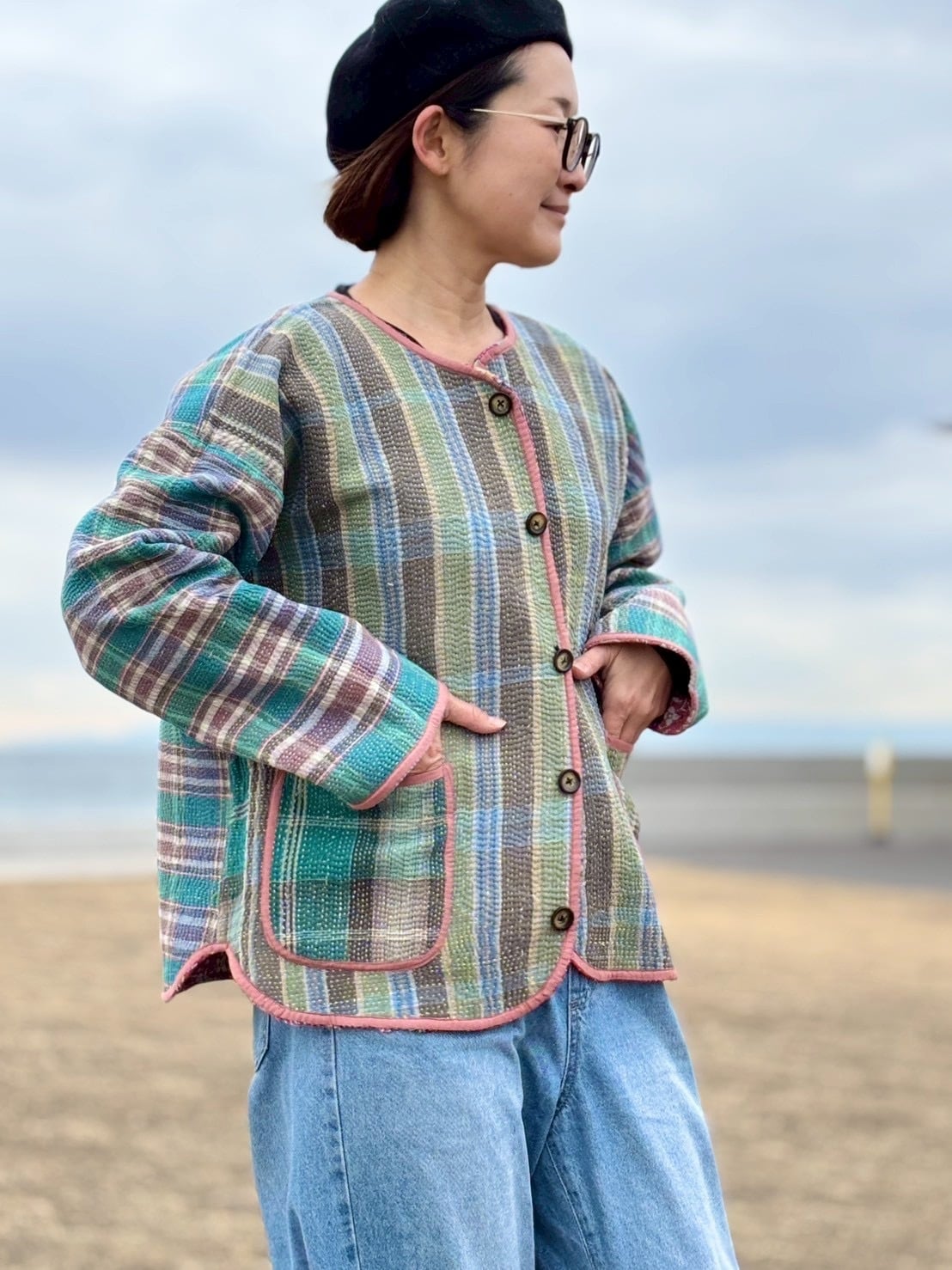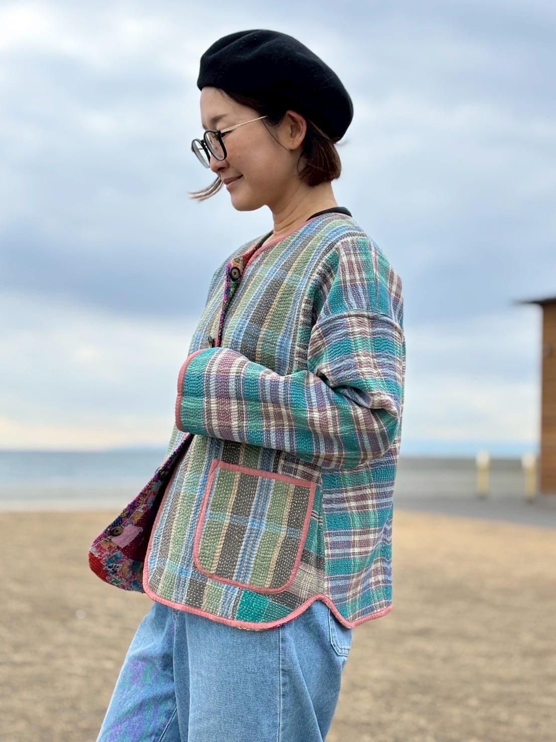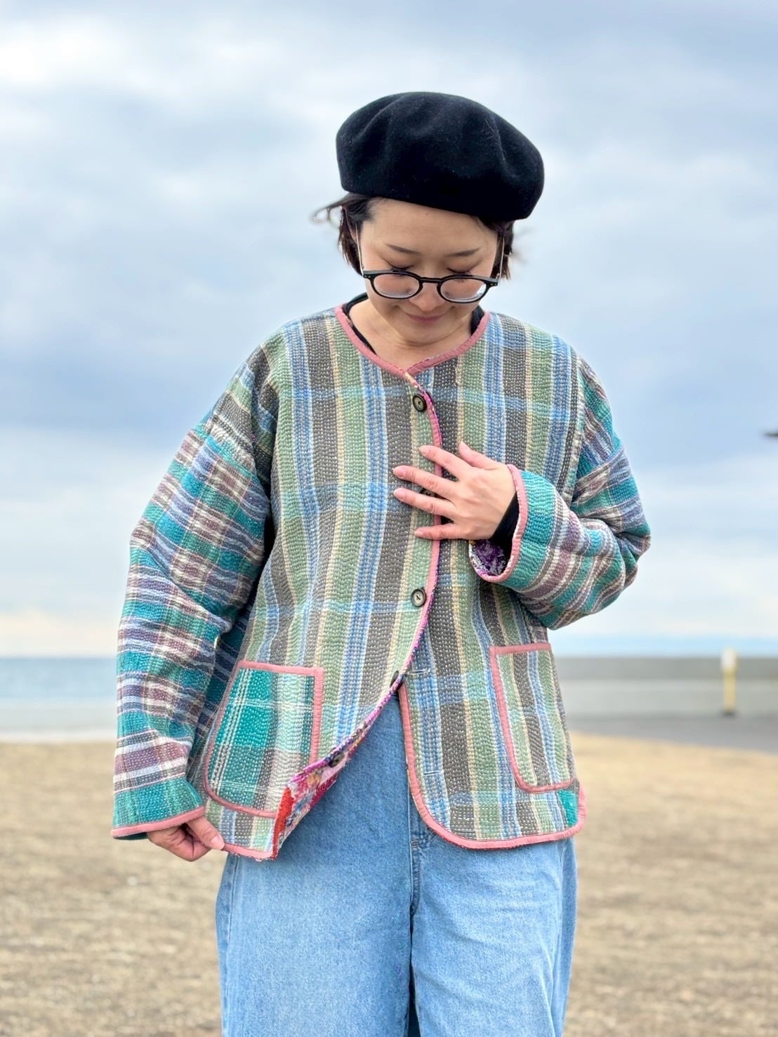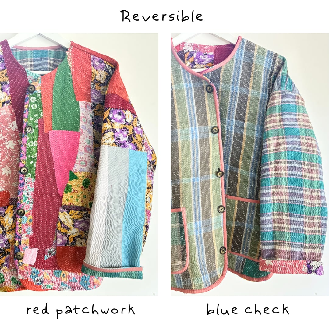 ラリーキルトボタンジャケット✴︎レッドパッチワーク×ブルーチェック