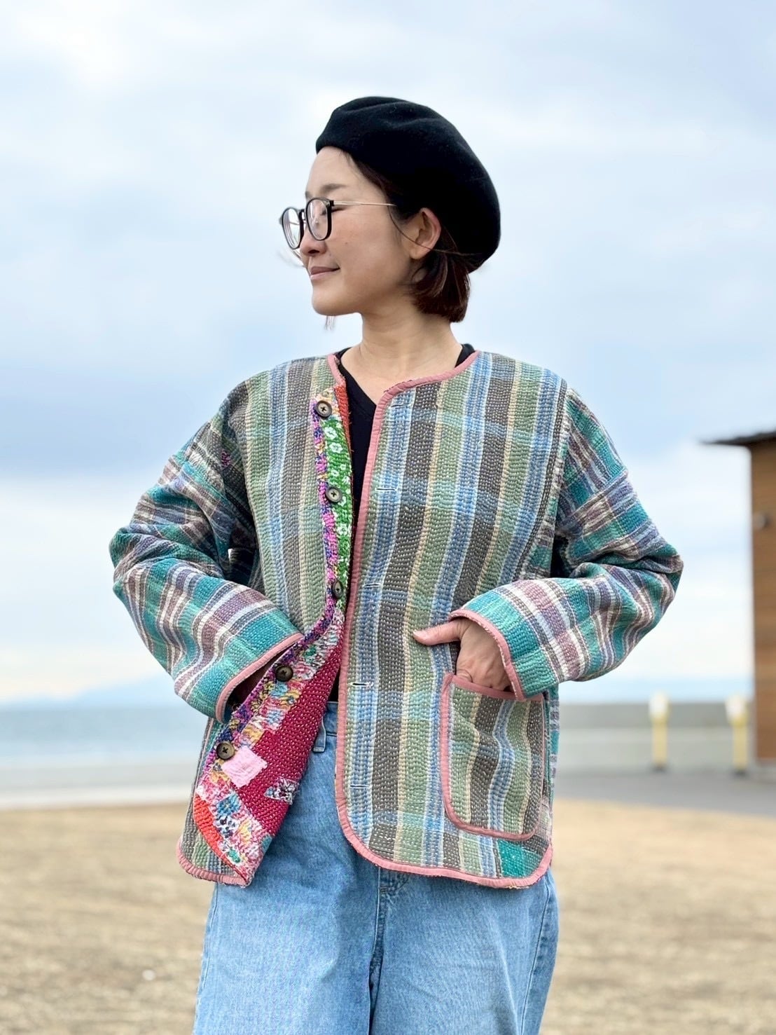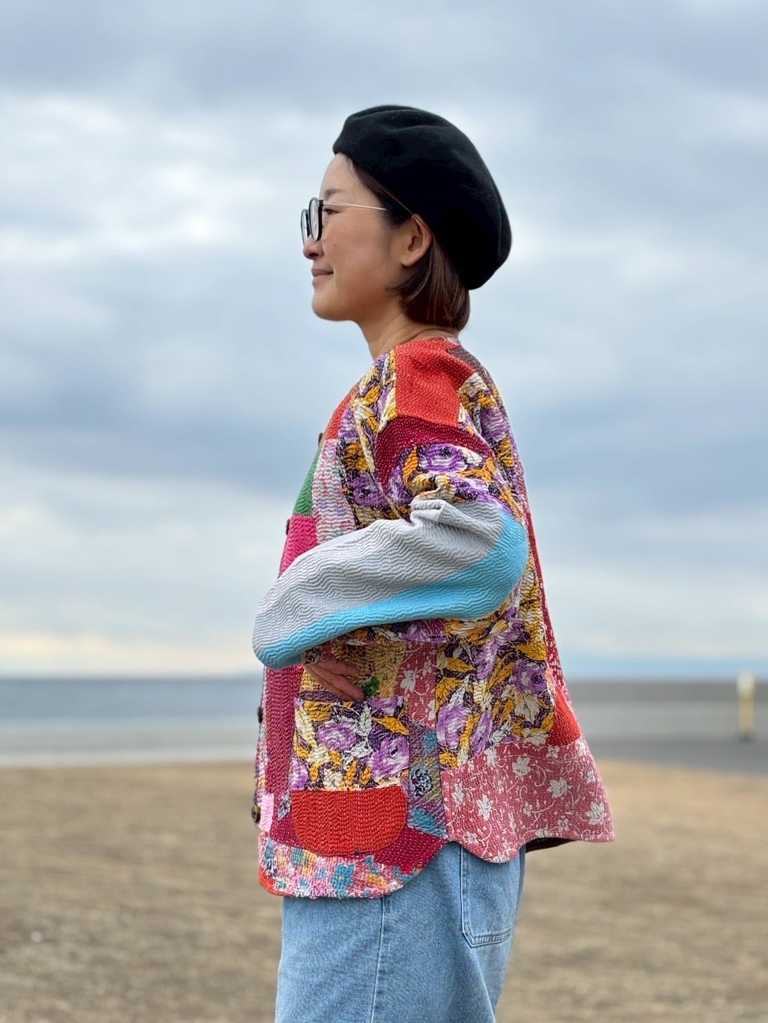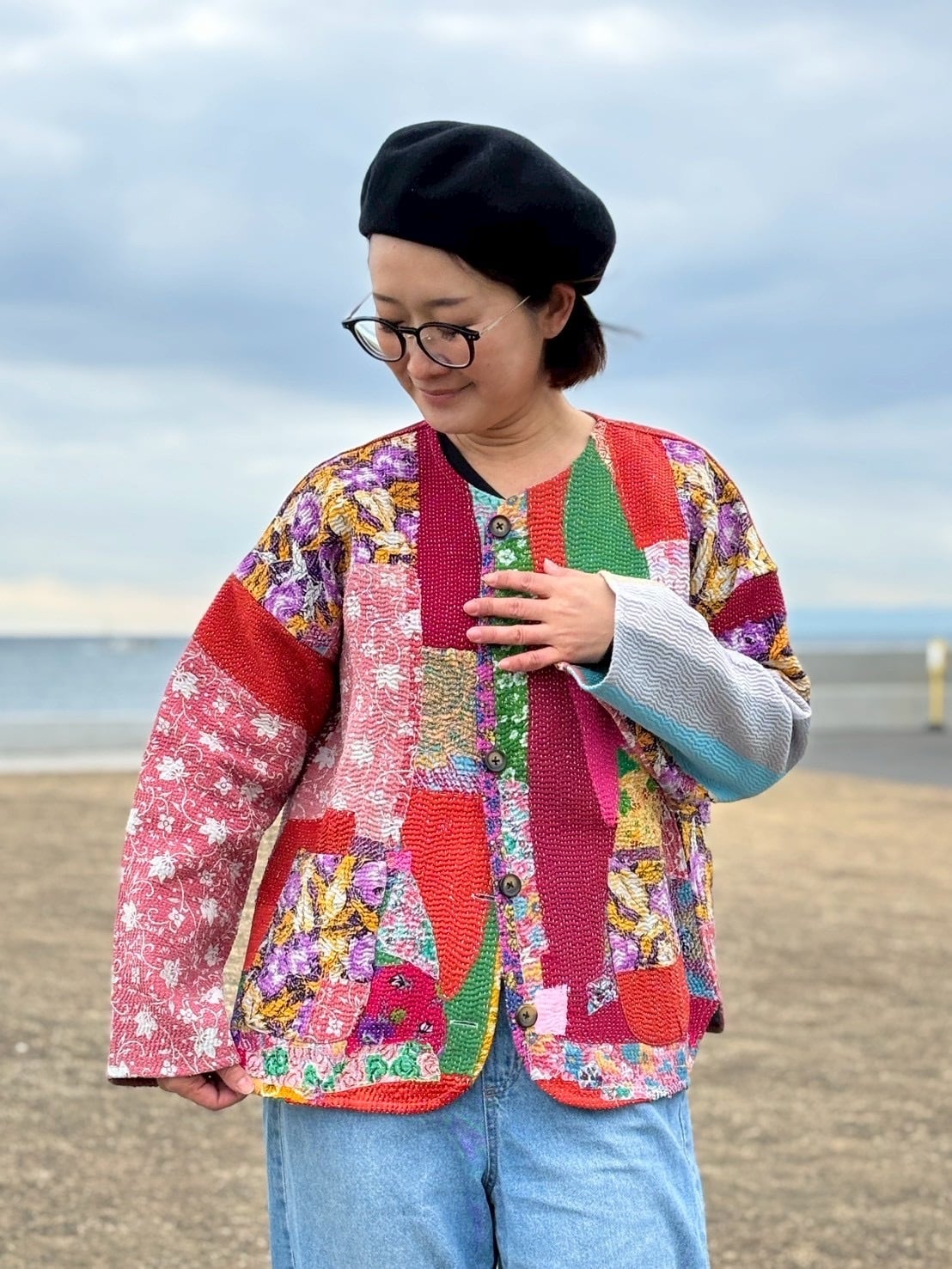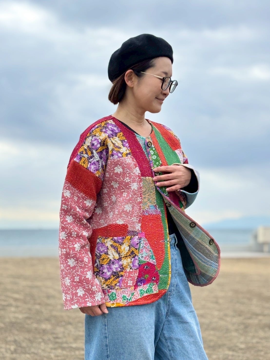 ラリーキルトボタンジャケット✴︎レッドパッチワーク×ブルーチェック